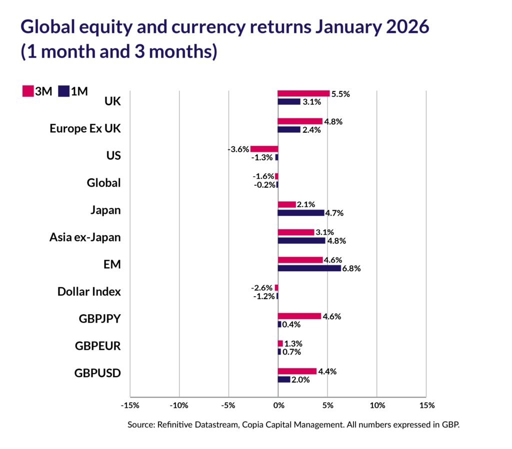 Domestically, protests erupted across the US following the murders of Renee Good and Alex Pretti by ICE and Border Patrol agents. Concerns about the independence of the Federal Reserve were heightened when the Department of Justice (DOJ) launched a criminal investigation into Fed Chair, Jerome Powell. In response, Powell said he was being threatened with criminal charges because the Fed had been setting interest rates, “based on our best assessment of what will serve the public, rather than following the preferences of the president.” Later in the month, Trump nominated Kevin Warsh to replace Powell when he leaves his post in May. Warsh has backed maintaining higher interest rates in the past and markets reacted positively to what many perceive to be a safer choice than some of the other rumoured candidates. However, Warsh’s ties to Trump allies like Ronald Lauder, and the DoJ’s investigation into Powell could hold up the confirmation process.